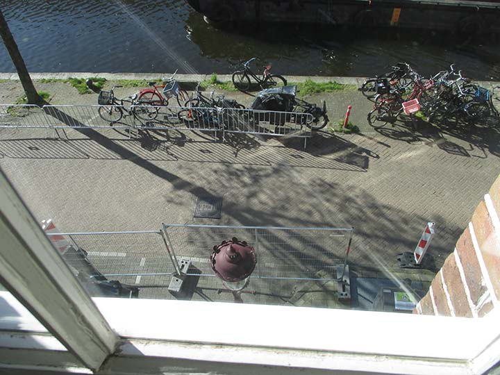 Na lang geen uitzicht te hebben gehad door een steiger voor ons pand wordt het zicht nu gevuld door de werklieden die de kade gaan herstellen